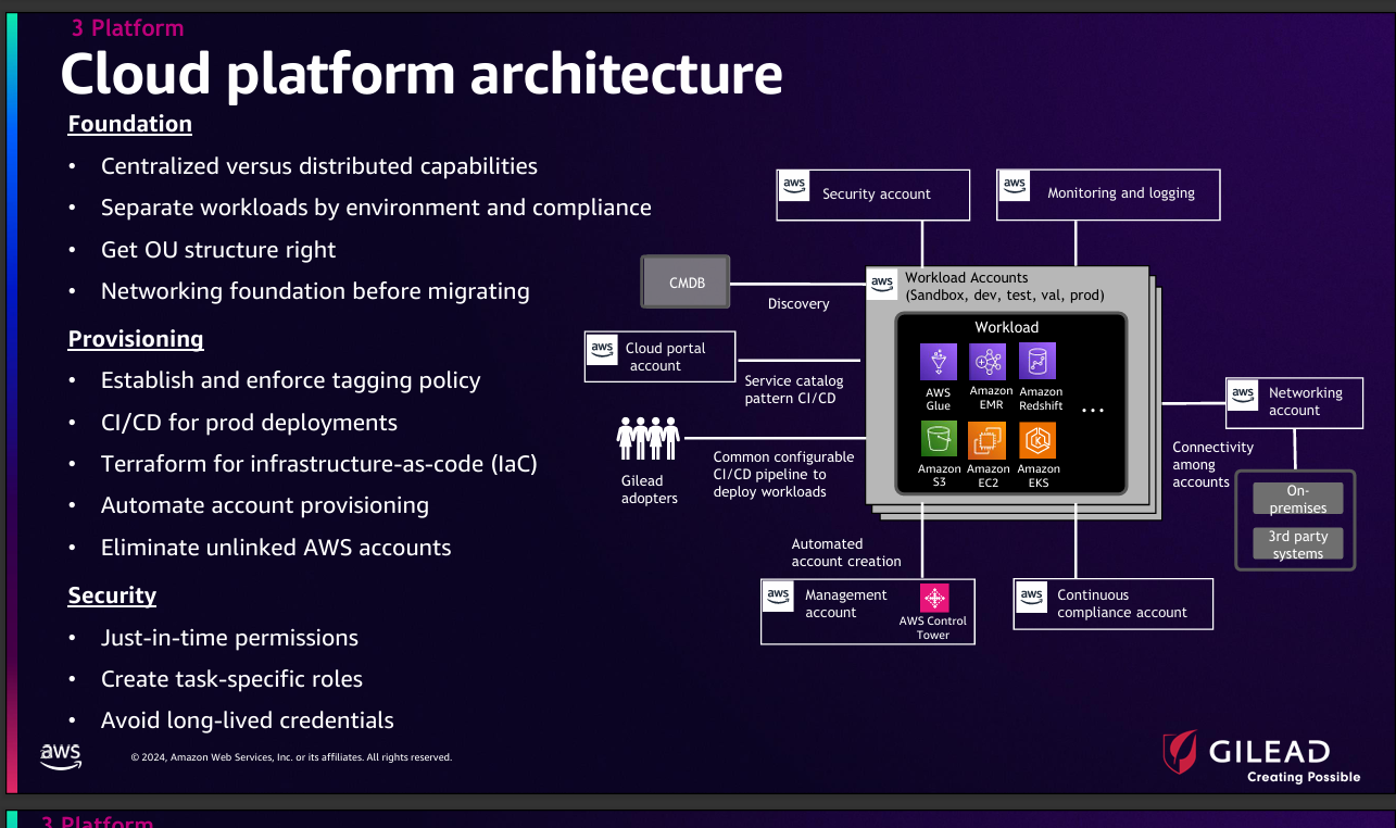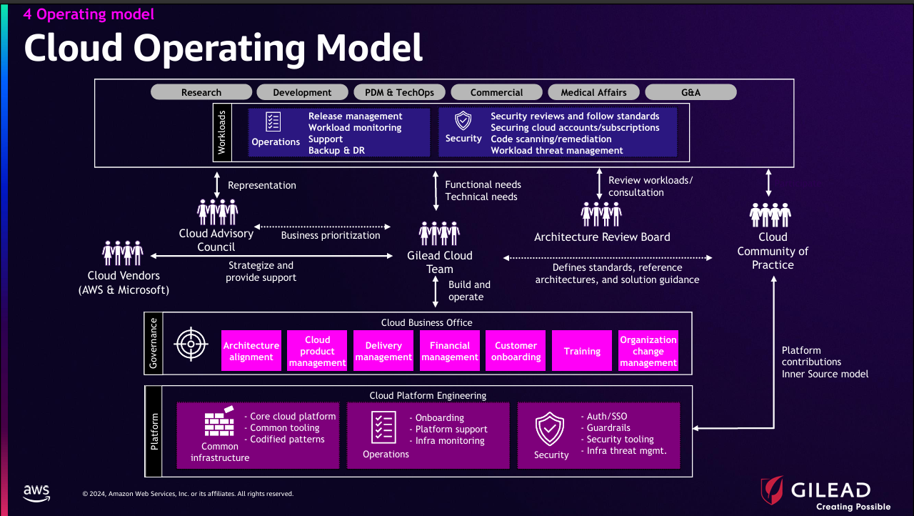 Gilead Sciences in 2019 faced common enterprise cloud adoption challenges that had compounded over multiple years and consulting engagements. Multiple teams were involved: an existing consultancy managing the AWS infrastructure, ThoughtWorks building the data platform, and various internal teams executing lift-and-shift migrations in phases.